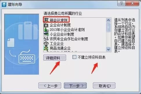 4 .)設置公司所屬行業:請選擇公司所屬行業”—選【新會計準則】,單擊“詳細資料”可以查看所選行業模板的預設科目。如果選擇的是“不建立預設科目表”,建好賬套后沒有預設科目。