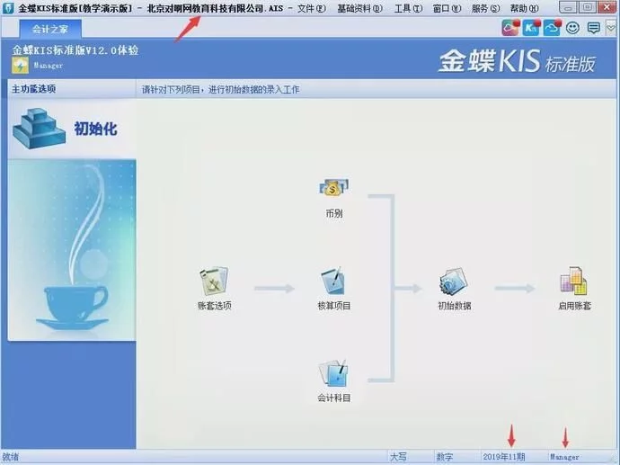 9)下圖是新建賬套后,自動進入的賬套初始化界面,右下角是當前打開的賬套的年、月以及登錄的操作員。