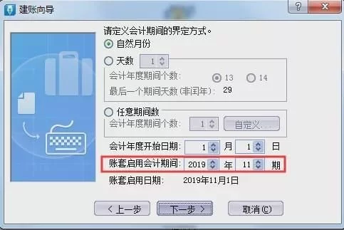 賬套啟用會計期間: 就是用戶開始輸入數據的年和月。(例如:想從 2019年 11 月份開始錄入賬務資料,賬套啟用期間就應該是 2019 年 11 期。會計開始日期大陸地區一般都是 1 月 1 號)